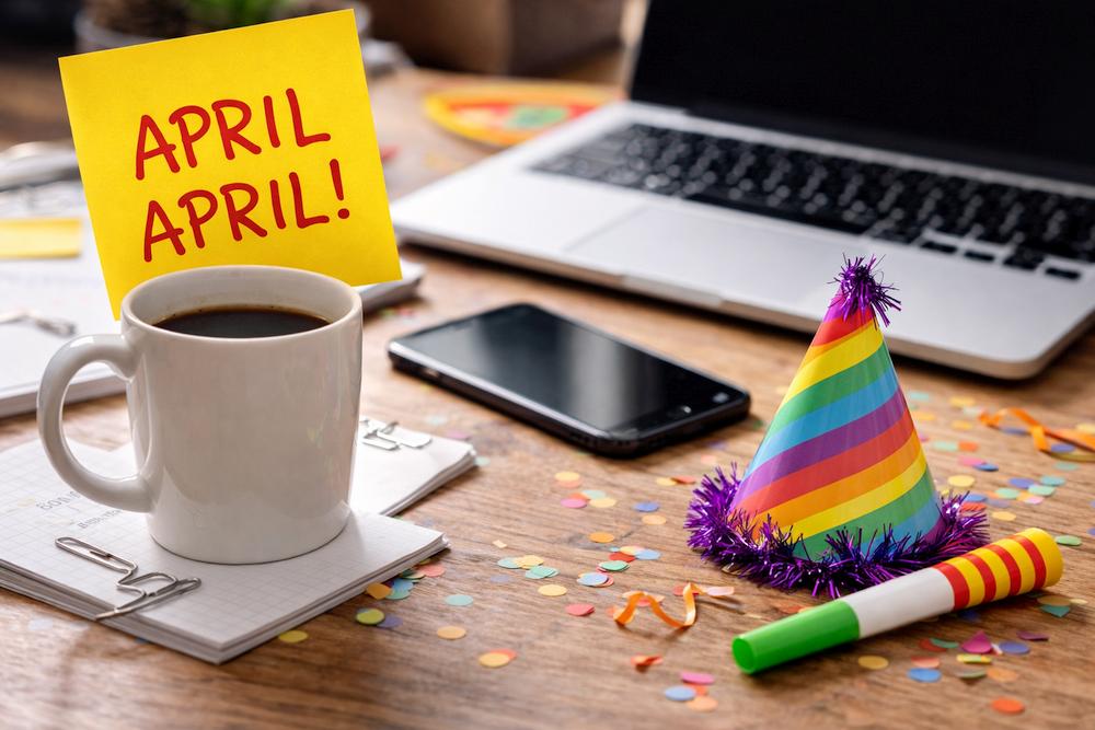 KI-generiertes Bild eines zwangslustigen Schreibtischs mit Kaffee, Laptop und April-Kram als Symbol für den 1. April.Heute bitte skeptisch bleiben