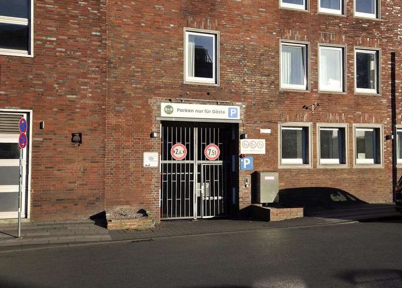 Der Parkplatz am B&B HOTEL Duisburg Hbf-Nord liegt direkt am Hotel, seitlich am Gebäude, rund 25 Meter links neben dem Hoteleingang, hinter einem vergitterten Tor.